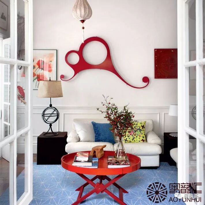 蓝色,令人产生遐想的色彩,传统蓝色是热带风情的体现,与鲜花想映衬,简洁白辅之,在客厅里显得色调柔和,伴随着的是空间里轻盈氛围。
